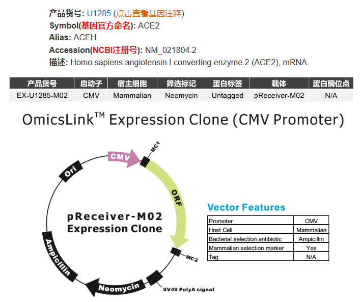 为加快对2019-nCoV病毒及疾病的基础研究,广州复能基因有限公司现无偿为学术界提供编码冠状病毒受体(hACE2, angiotension I converting enzyme 2 或称:angiotensin-converting enzyme 2)基因的表达载体(EX-U1285-M02)。