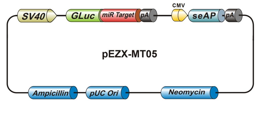 在pEZX-MT05载体中,我们将3’UTR序列(来源于公开的基因序列数据库)插入到Gaussia荧光素酶报告基因下游,在哺乳动物细胞中由SV40启动子驱动转录生成Gaussia荧光素酶(Gluc)和3’UTR靶标序列的嵌合mRNA,因此无需裂解细胞实时监测Gluc的表达,研究mRNA-miRNA的相互作用。在相同载体(pEZX-MT05)上带有分泌型碱性磷酸酶(SEAP)报告基因。CMV启动子驱动转录的SEAP作为同质粒内的对照,这种双报告系统可以对多样本常规转染进行精确比较。