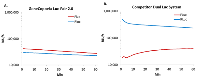图 1. 荧光信号的稳定性比较。以 GeneCopoeia pEZX-MT06 miRNA 报告载体转染 HEK 293 细胞,转染 48 小时后分别检测荧光信号,效果如上图所示。从图中可知,GeneCopoeia 试剂盒(图A)的 Fluc 及 Rluc 均在 60 分钟内保持信号稳定,竞争对手品牌的试剂盒(图B)荧光信号在前 30 分钟已出现较大波动。
