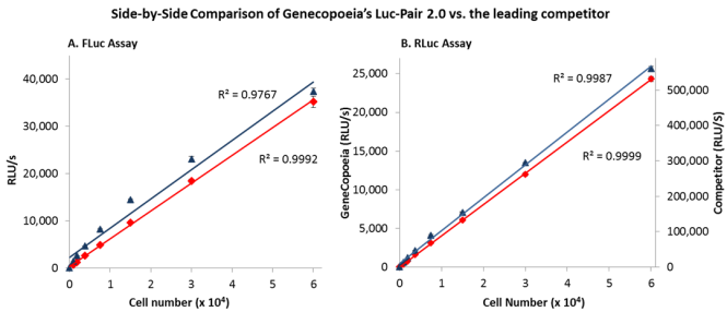 图 2. 转入细胞的载体数量与荧光激发量的线性关系比较。以 GeneCopoeia pEZX-MT06 miRNA 报告载体转染 HEK 293 细胞,转染48小时后,按梯度取不同细胞数量,溶解细胞后分别检测荧光信号,效果如上图所示。从图中可知,GeneCopoeia 试剂盒(红色)检测所得结果中,Fluc 和 Rluc 的线性关系比较好,竞争对手品牌的试剂盒(蓝色)检测所得结果的线性关系相对较差。