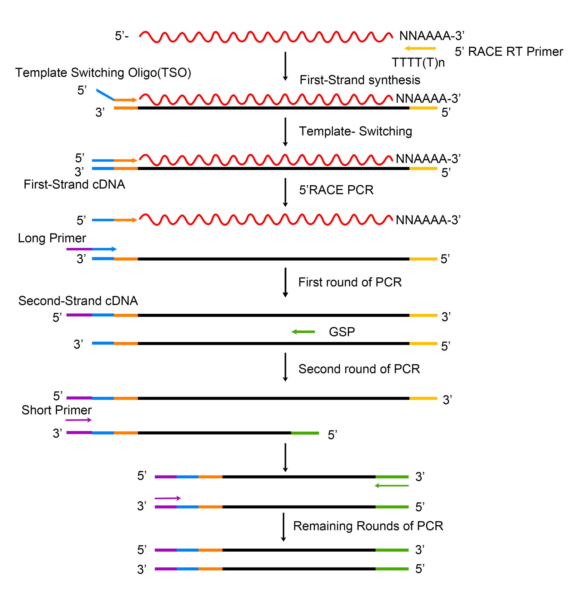 RACE(Rapid Amplification of cDNA Ends)即 cDNA 末端快速扩增技术,是以部分区域已知序列为起点,对未知基因的 cDNA 末端快速扩增技术。AccelerRT® 5′ RACE Kit以10 ng -1μg总RNA为模板高效逆转 cDNA,并以 cDNA 为模板快速扩增其 5’末端。