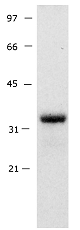 Figure 1. GFP western blot analysis of 293 cells transfected with a GFP construct. The antibody shows a 33 kDa band.