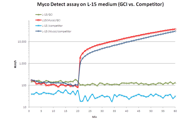 图1. MycoGuard™支原体检测试剂盒与某公司同类试剂盒的灵敏度对比 两家公司的产品分别检测含支原体污染的L-15培养基以及阴性对照的培养基 (GCI: 红&绿;某公司: 深蓝&浅蓝)。添加底物后,两家公司的检测试剂盒在支原体污染的样品中均有较明显的数值攀升,且数值上升趋势稳定。GeneCopoeia (GCI)的试剂盒在阴性对照中,添加底物后的数值基本不变,比竞争对手公司的数值更稳定。
