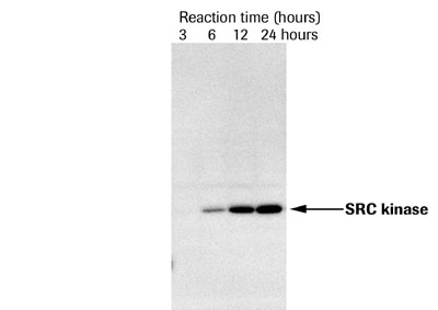 Figure 3: Western blot analysis of SRC kinase expression in the RTS 100 Wheat Germ CECF Kit. After 3, 6, 12, and 24 hours of expression, 0.5 µl samples of expression reactions were analyzed by SDS-PAGE then stained with an anti-His6-peroxidase antibody.